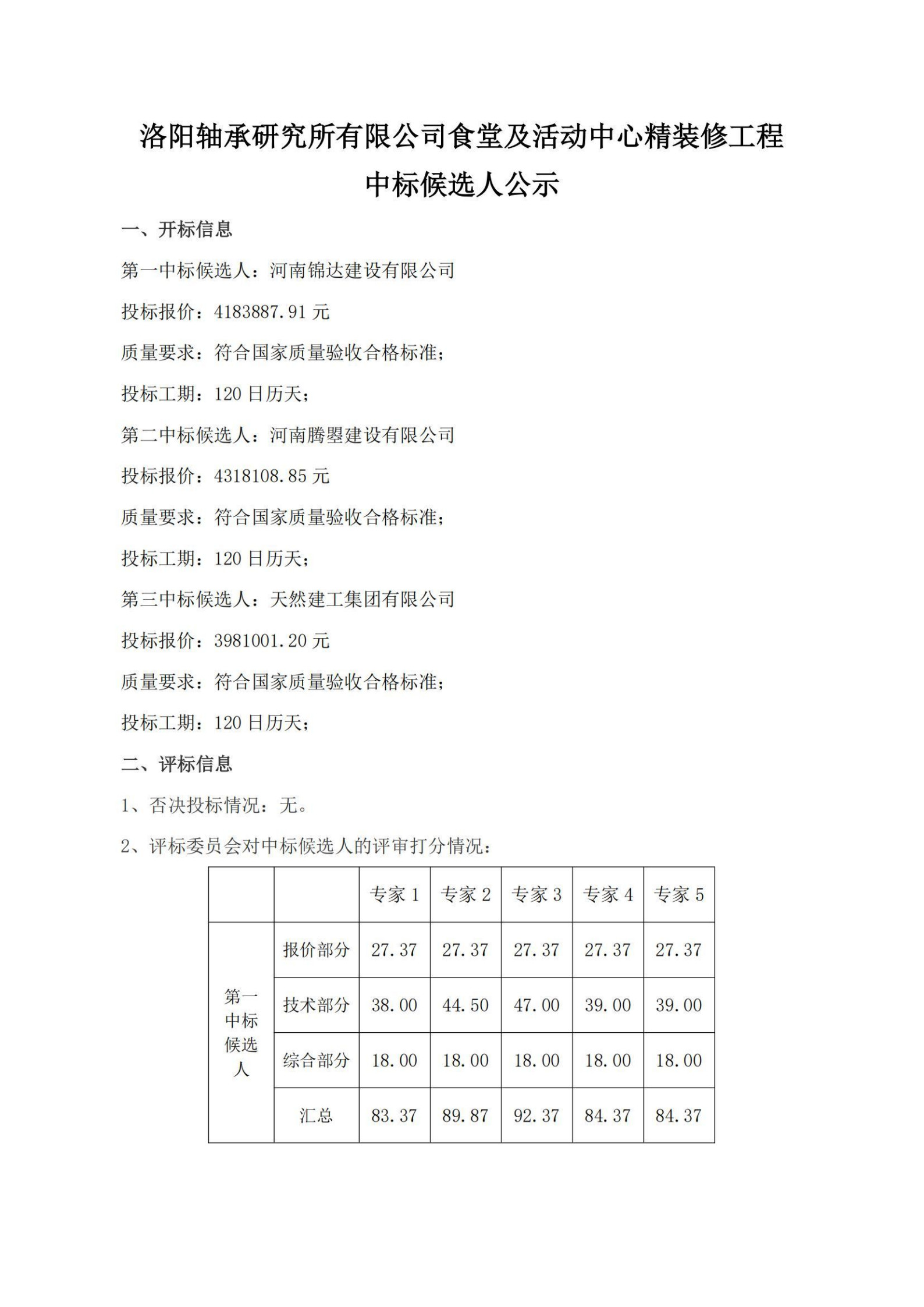 洛陽軸承研究所有限公司食堂及活動(dòng)中心精裝修工程中標(biāo)候選人公示