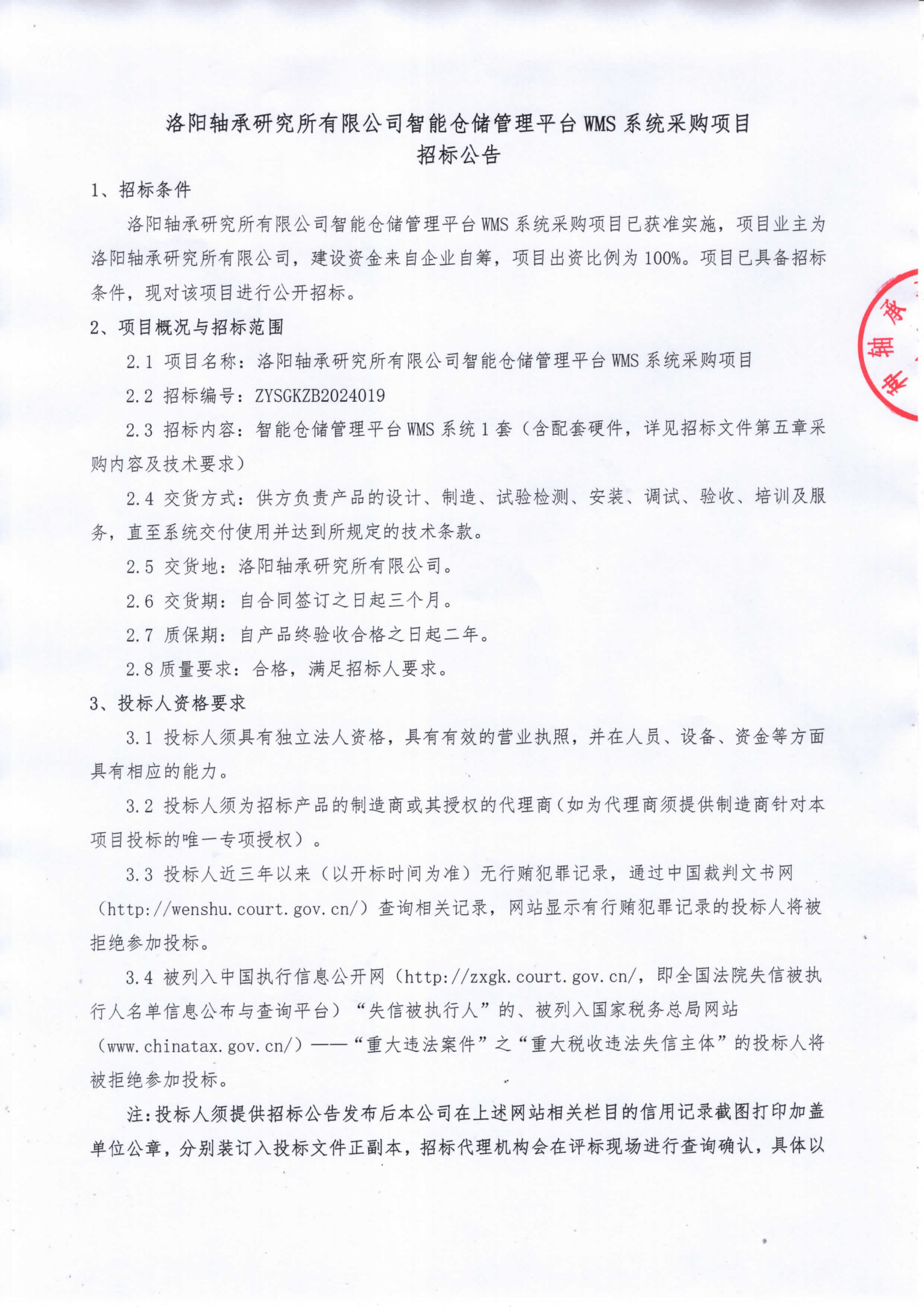 洛陽軸承研究所有限公司伊濱科技產(chǎn)業(yè)園2#廠房立體庫設(shè)備采購項(xiàng)目中標(biāo)公告