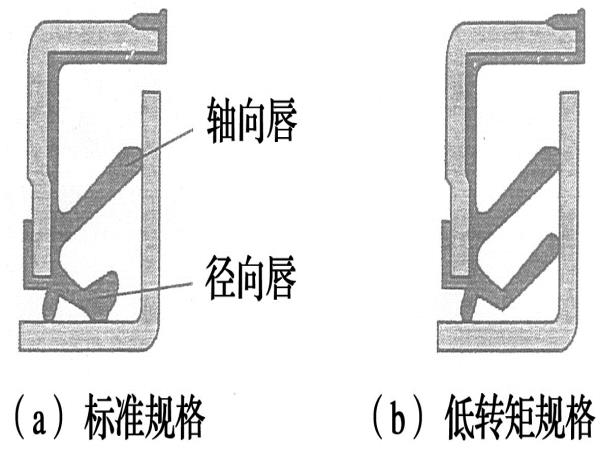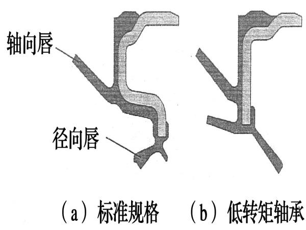 低轉(zhuǎn)矩設(shè)計(jì)方案:通過去除徑向唇,并使軸向唇雙重化(圖6),實(shí)現(xiàn)了軸承的高密封性和低轉(zhuǎn)矩化的目標(biāo)。