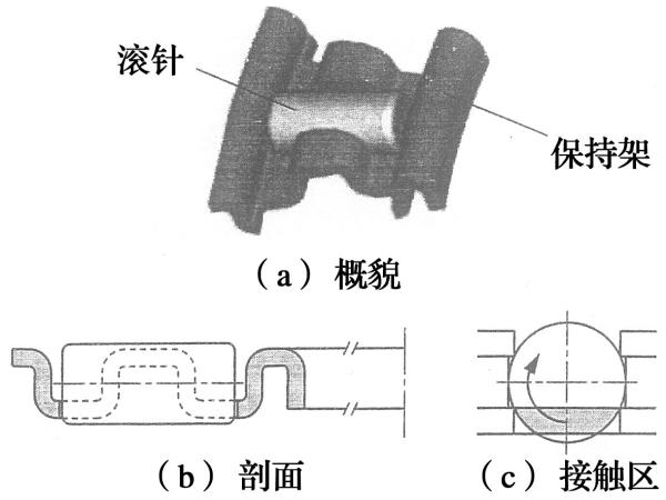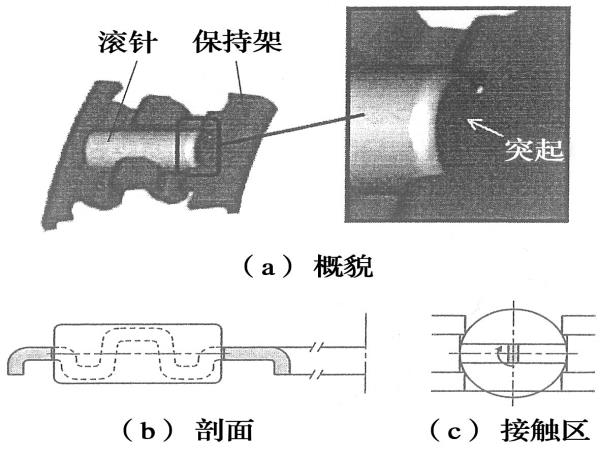 低轉(zhuǎn)矩設(shè)計(jì)方案:將滾子端面和保持架兜孔端的接觸處靠近周向速度小的滾子的軸心;通過將保持架兜孔端面設(shè)置突起,減小接觸面積;通過將滾子復(fù)數(shù)排列(對(duì)一個(gè)保持架兜孔配置2個(gè)短滾子)減小了滾子和滾道的周向速度差。從而抑制滑動(dòng)摩擦,降低軸承轉(zhuǎn)矩(圖4)。