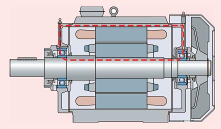 在定子繞組的三相之間,共模干擾產(chǎn)生不對(duì)稱(chēng)電流,圍繞定子周?chē)碾娏骺偤筒粸?/span>0。圍繞軸的高頻流變化產(chǎn)生了高頻軸電壓。因此,軸向流動(dòng)的電流很危險(xiǎn),該電流可穿過(guò)轉(zhuǎn)子軸、軸承、定子以及后面的其他軸承(圖5)。