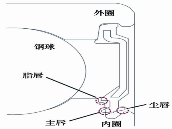 1)脂唇→內(nèi)部密封槽的迷宮結(jié)構(gòu)減少了潤滑脂對(duì)主唇周圍區(qū)域的滲入,以防止漏脂。