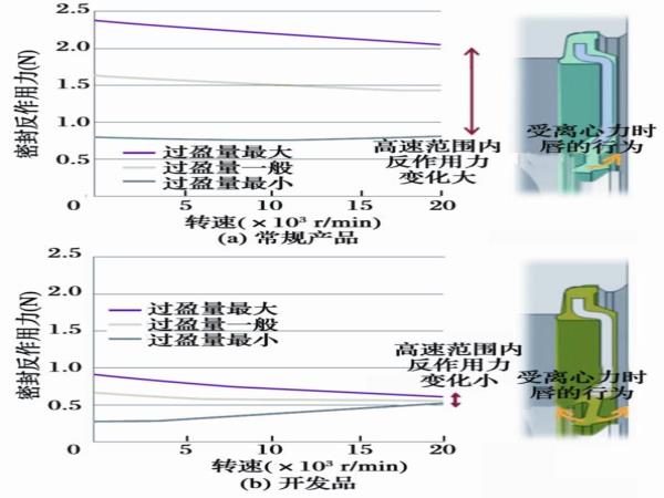 并進(jìn)一步將密封唇的重心和唇部腰部的厚度進(jìn)行了優(yōu)化,降低唇的剛度,以盡量減少高速旋轉(zhuǎn)范圍內(nèi)反作用力的變化,從而降低熱量且保持低轉(zhuǎn)矩;為提高密封唇跟隨性,增加了密封過盈量。