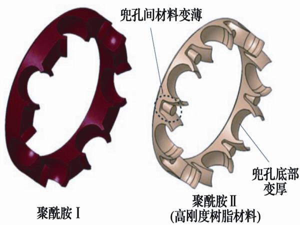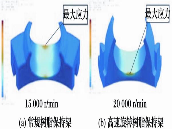 為減少高速旋轉(zhuǎn)時(shí)的保持架變形,通過兜孔底部加厚、采用高強(qiáng)度材料以提高保持架剛度;保持架兜孔間材料減少以降低離心力。
