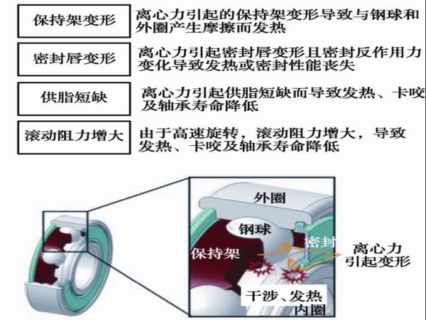 高速旋轉(zhuǎn)時(shí),保持架由于離心力而變形,導(dǎo)致與鋼球和外圈產(chǎn)生摩擦而發(fā)熱。此外,由于皮帶輪用軸承為外圈旋轉(zhuǎn),離心力施加于密封唇,密封反作用力的變化導(dǎo)致發(fā)熱或密封性能降低。此外,供脂短缺和滾動(dòng)摩擦增大可能造成卡咬或軸承壽命降低。
