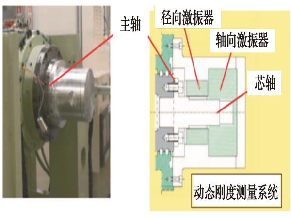 動態(tài)剛度測量系統(tǒng)如圖1所示。該系統(tǒng)由徑向激振器和軸向激振器組成,安裝在主軸箱上。采用非接觸法,利用電磁鐵的吸力將一個芯軸安裝在主軸端部,然后以不同頻率振動,用傳感器檢測此時的位移。