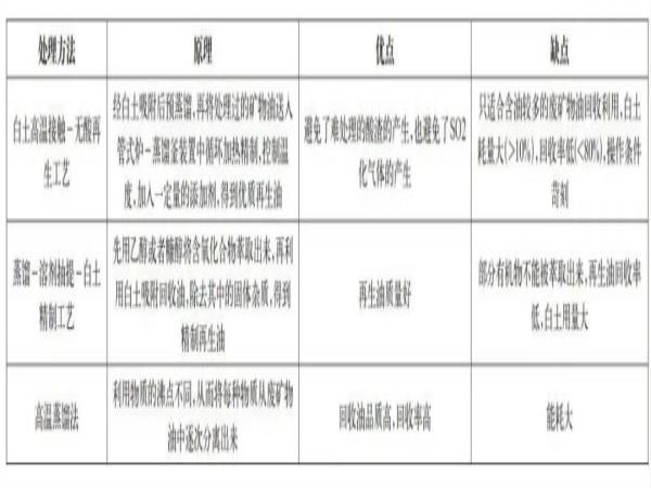 幾種資源化處理方法,有土高溫接觸-無(wú)酸再生工藝、蒸餾-溶劑抽提-白土精制工藝、高溫蒸餾法,詳見(jiàn)表3。