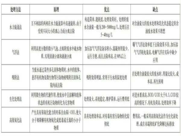 切削液廢水在進(jìn)行破乳預(yù)處理后,必須要進(jìn)行深度處理才能排放,深度處理主要是去除廢水中部分油類物質(zhì)和溶解性有機(jī)物、懸浮物、氨氮等等。幾種無(wú)害化處理方法比較,有水力旋流法、氣浮法、吸附法、生化處理法、高級(jí)氧化法,詳見(jiàn)表2。