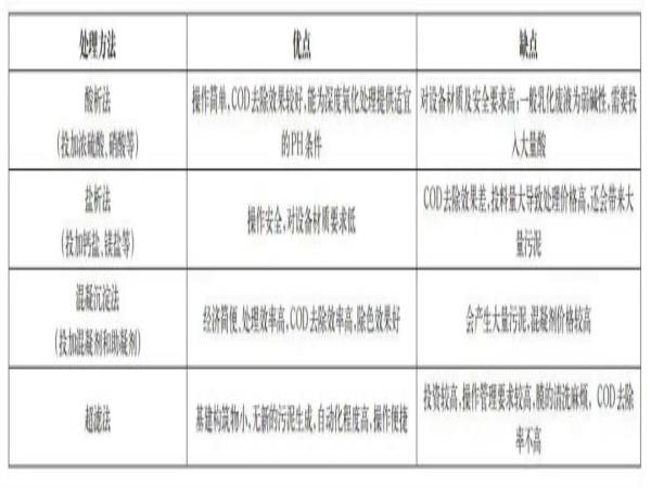 切削廢液因其成分復(fù)雜,化學(xué)穩(wěn)定性好,故直接處理難度較大,一般需要做預(yù)處理。預(yù)處理主要是對(duì)廢液進(jìn)行破乳,以除去廢液中油包水或者水包油中的油類物質(zhì)。幾種破乳方法比較,有酸析法、鹽析法、混凝沉淀法,詳見(jiàn)表1。