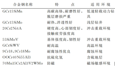 材料的發(fā)展帶動著軸承的發(fā)展,軸承材料的優(yōu)選往往能起到事半功倍的效果。動力鉆具軸承材料需要具有高的表面硬度,高耐磨性,高強(qiáng)度,高剛度和良好的韌性,以及耐高溫和耐腐蝕的能力。目前常用的軸承材料見表1。