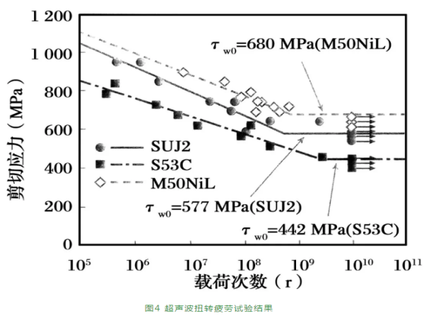 超聲波扭轉(zhuǎn)疲勞試驗機(jī)主要由扭轉(zhuǎn)振動變換器(激振頻率為(20 000±500)Hz)、放大器、扭轉(zhuǎn)振動放大變幅桿等組成。采用本試驗機(jī)評價高碳鉻軸承鋼SUJ2、結(jié)構(gòu)碳鋼S53C、高溫滲碳鋼M50NiL的結(jié)果如圖4所示。根據(jù)時間強(qiáng)度、疲勞極限來評價,那么S53C最低,M50NiL最高。