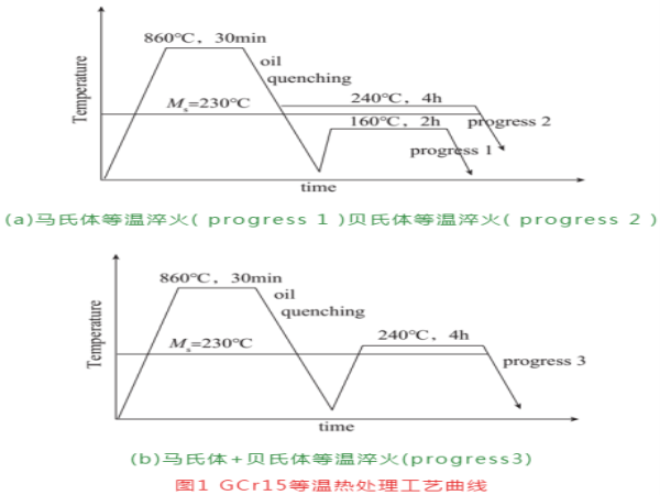 GCr15 軸承鋼具有良好的耐腐蝕性和耐磨性以及較高的抗壓強度,屈服極限為2 000 MPa,熱處理后抗拉強度能夠達到2250MPa。GCr15軸承鋼常用熱處理方法有4種:第1種為淬火后直接冷卻至室溫,獲得馬氏體組織;第2種為馬氏體等溫淬火,經(jīng)回火后獲得回火馬氏體組織;第3種為貝氏體等溫淬火,獲得貝氏體組織;第4種為馬氏體+貝氏體混合等溫淬火組織,回火后獲得回火馬氏體+貝氏體混合組織。GCr15 鋼等溫熱處理工藝曲線見圖1。