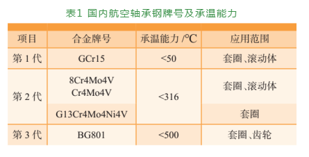目前國內(nèi)航空軸承的制造和使用仍然以GCr15、8Cr4Mo4V和G13Cr4Mo4Ni4V為主,國內(nèi)軸承鋼的分類和應(yīng)用情況如表1所示。軸承鋼的使用溫度及力學性能水平?jīng)Q定了軸承鋼的發(fā)展歷程。在使用溫度不高的情況下,主要以GCr15為主,隨著發(fā)動機推重比的提升,對軸承的強度和承溫能力提出更高的要求。因此,設(shè)計仿制的8Cr4Mo4V鋼應(yīng)運而生,其使用溫度可達316℃,但是該鋼的沖擊韌性低,為了提高軸承抵抗沖擊的能力,又發(fā)展出了G13Cr4Mo4Ni4V鋼,其使用溫度與8Cr4Mo4V鋼相當,為滲碳后使用的軸承套圈用鋼,大幅度提高了軸承套圈的耐沖擊能力,但與之相配合的滾動體仍然采用8Cr4Mo4V鋼。隨著軸承制造技術(shù)的改進和使用溫度的進一步提高,軸承制造結(jié)構(gòu)越來越復(fù)雜,甚至要求軸承和齒輪一體制造,這就需要制造材料既能滿足軸承套圈的使用要求,又能滿足齒輪的使用要求,因此既適用于制造軸承,又適用于制造齒輪的鋼種BG801誕生了。