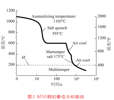 M50鋼經(jīng)奧氏體化后,采用任何冷卻速率,在15min內(nèi)將奧氏體冷卻至205℃或者更低,都能夠產(chǎn)生高硬度。為了降低變形、殘余應(yīng)力和裂紋形成傾向,最佳的冷卻工藝曲線如圖3所示。