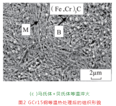 GCr15軸承鋼的貝氏體等溫淬火相較于常規(guī)的淬火+低溫回火,能提高鋼的比例極限、屈服強度抗彎強度和斷面收縮率,具有更高的沖擊韌性和斷裂韌性,尤其適合耐沖擊和潤滑不良的鐵路軸承。獲得3種組織的GCr15鋼的硬度均能滿足軸承使用要求,研究結(jié)果表明下貝氏體的硬度低于馬氏體的硬度,GCr15鋼的硬度隨著馬氏體量的減少和貝氏體量的增加而降低,下貝氏體、下貝氏體+馬氏體復(fù)合組織的強度均高于回火馬氏體。下貝氏體組織、下貝氏體+馬氏體復(fù)合組織的沖擊韌性高于回火馬氏體組織的沖擊韌性。