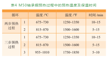 為了獲得最佳的軸承性能,熱處理加熱期間可采用2次或3次預(yù)熱處理,然后進行淬火,再進行深冷處理或回火處理,回火處理要求冷卻至40℃以下。M50軸承鋼可以在真空爐或氣體保護爐中進行加熱奧氏體化處理,大多數(shù)軸承制造熱處理選擇在中性熔融鹽浴或鹽浴槽中進行。零件在奧氏體化前應(yīng)該預(yù)熱,以降低高溫奧氏體化階段的保溫時間。如果采用單級預(yù)熱,預(yù)熱溫度采用815~870℃,保溫時間為5~15min。如果采用多級預(yù)熱,要求的溫度及保溫時間見表4。