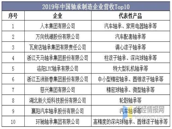 目前,我國(guó)軸承產(chǎn)品以中低端產(chǎn)品為主,中高端軸承產(chǎn)品仍主要由軸承行業(yè)大型跨國(guó)公司占據(jù)。但隨著我國(guó)軸承行業(yè)基礎(chǔ)理論研究逐步深入,制造工藝和工藝裝備技術(shù)水平不斷提高,我國(guó)軸承行業(yè)整體附加值、技術(shù)含量與國(guó)際先進(jìn)水平差距呈現(xiàn)逐漸減少態(tài)勢(shì)。隨著我國(guó)軸承行業(yè)高附加值、高技術(shù)含量、高精度、長(zhǎng)壽命等產(chǎn)品水平進(jìn)一步提升,逐步實(shí)現(xiàn)國(guó)產(chǎn)中高端軸承產(chǎn)品替代進(jìn)口產(chǎn)品,我國(guó)軸承行業(yè)市場(chǎng)空間將進(jìn)一步擴(kuò)大。2019年中國(guó)軸承制造企業(yè)營(yíng)收前十為: