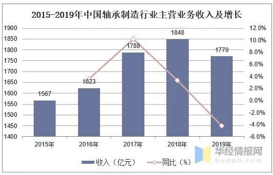 從軸承行業(yè)收入來看,據(jù)統(tǒng)計(jì),2019年中國(guó)軸承制造行業(yè)主營(yíng)業(yè)務(wù)收入為1770億元,同比下降4.22%。