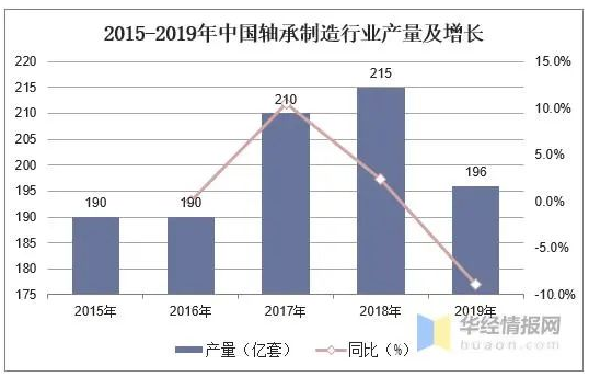產(chǎn)量方面,據(jù)統(tǒng)計(jì),2019年中國(guó)軸承制造行業(yè)產(chǎn)量為196億套,同比下降8.84%。