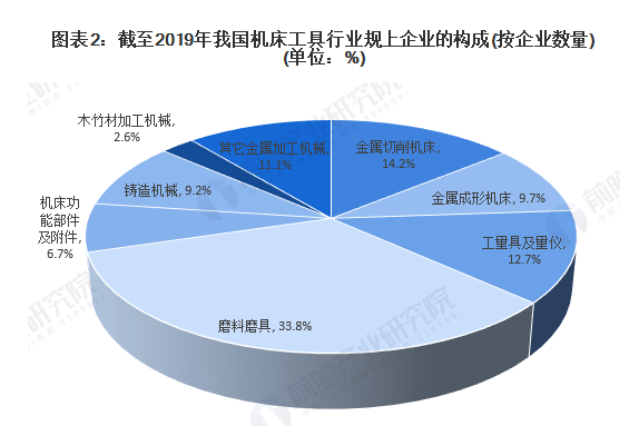 機(jī)床工具行業(yè)企業(yè)結(jié)構(gòu)方面,截至2019年12月,我國(guó)機(jī)床工具行業(yè)規(guī)模以上企業(yè)總數(shù)共5710家,涉及八個(gè)分行業(yè),包括金屬切削機(jī)床、金屬成形機(jī)床、工量具及量?jī)x、磨料磨具、機(jī)床功能部件及附件等。其中磨料磨具企業(yè)數(shù)量最多,達(dá)到1947家,占比達(dá)到33.8%,其次金屬切削機(jī)床企業(yè)為816家,占比為14.2%。