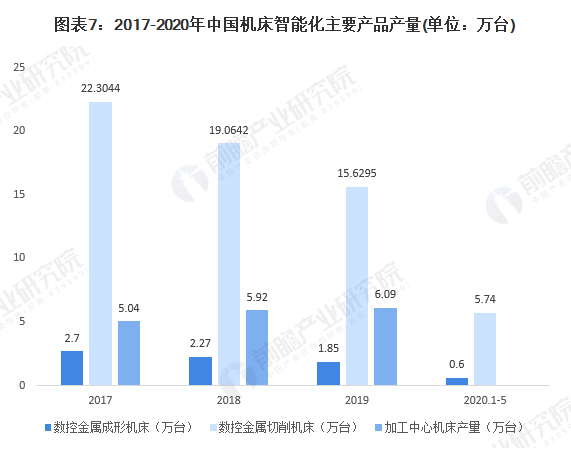 從數(shù)量來(lái)看,數(shù)控金屬成型機(jī)床、數(shù)控金屬切削機(jī)床數(shù)量逐年下降,加工中心機(jī)床產(chǎn)品逐漸增加。2019年加工中心機(jī)床產(chǎn)量達(dá)到6.09萬(wàn)臺(tái)。加工中心機(jī)床是一種多工序復(fù)合加工數(shù)控機(jī)床,并正向高速、高精度和5軸聯(lián)動(dòng)方向發(fā)展。