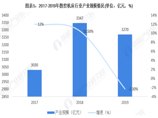 數(shù)控機(jī)床方面,受數(shù)控機(jī)床行業(yè)整體需求結(jié)構(gòu)調(diào)整及升級(jí),下游領(lǐng)域不景氣影響,2019年我國(guó)數(shù)控機(jī)床產(chǎn)業(yè)規(guī)模為3270億元,同比下降2.30%。