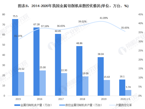 從機(jī)床具體數(shù)控化率來(lái)看,金屬切削機(jī)床行業(yè)是機(jī)床工具行業(yè)中經(jīng)濟(jì)規(guī)模最大、地位最顯著的產(chǎn)業(yè)領(lǐng)域。我國(guó)金屬切削機(jī)床產(chǎn)量數(shù)控化率波動(dòng)提升,從2015年的31.15%上升至2019年的41.09%。隨著自動(dòng)化、數(shù)字化潮流的興起,數(shù)控機(jī)床得到了快速發(fā)展,機(jī)床行業(yè)數(shù)控化率持續(xù)提高。