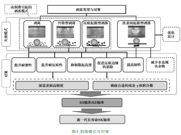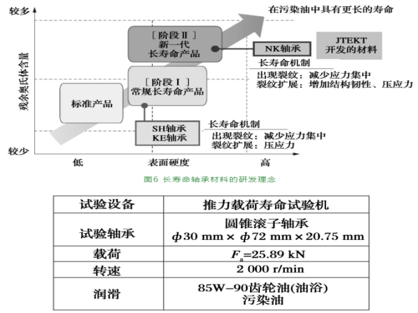 其次,針對由于潤滑不當而引起的溫升和卡咬問題,JTEKT開發(fā)了低摩擦力矩及低溫升軸承,為低溫升及卡咬最小化做出了貢獻。低力矩軸承的詳情見關(guān)鍵詞3部分內(nèi)容。已證實滾道表面高硬度與適量的殘余奧氏體(殘余γ)能有效減少由于異物進入而導(dǎo)致的剝落(圖4),而且通過使用JTEKT熱處理技術(shù),將上述特征應(yīng)用于SH軸承(指軸承鋼經(jīng)過特殊熱處理,主要用于球軸承)和KE軸承(指表面硬化鋼經(jīng)過特殊熱處理,主要用于圓錐滾子軸承),并且已實現(xiàn)商品化。