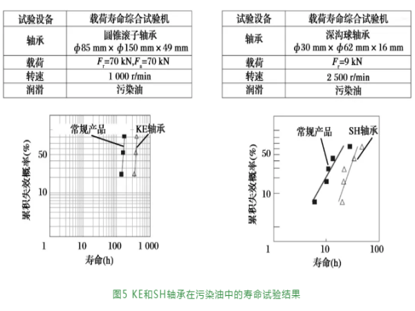 對KE和SH軸承在污染油中進行試驗,得出的疲勞壽命評估結(jié)果如圖5所示。在這些條件下,這2類軸承比標準軸承的壽命長約2倍。農(nóng)業(yè)與建筑機械制造商對進一步提升軸承壽命仍有很高的期望,因此JTEKT正持續(xù)推進新一代長壽命軸承的研發(fā)工作。