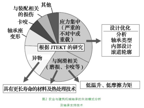 農(nóng)業(yè)與建筑機械軸承失效模式的分析結(jié)果如圖2所示,其中的重要挑戰(zhàn)就是解決由應(yīng)力集中(邊緣應(yīng)力)和潤滑不當而引發(fā)的問題。通過開發(fā)這類技術(shù)來提升軸承耐久性,對降低維護成本、減小部件尺寸有重要作用。
