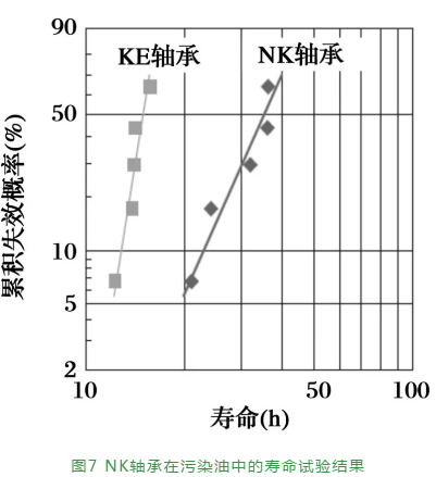 正如“改善壽命、節(jié)約資源的中碳軸承鋼的開發(fā)”(《國外軸承技術(shù)》2019年第4期)詳細所述,圖6所示的研發(fā)理念階段II中的區(qū)域就是利用已開發(fā)材料與熱處理技術(shù)所達到的成就。在污染油中對NK和KE軸承壽命進行評估的結(jié)果如圖7所示,證實了在此種條:件下NK軸承的壽命比KE軸承的長1.5倍。
