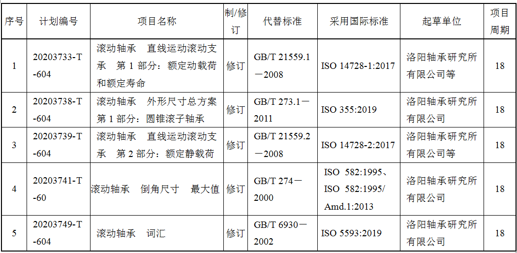 2020年11月19日,國家標準化管理委員會以國標委發(fā)[2020]48號文下達了2020年第三批國家標準制修訂計劃。本批共安排計劃531項,其中制定371項,修訂160項;推薦性標準524項,指導性技術(shù)文件7項。本次計劃中屬于滾動軸承領(lǐng)域的共5項,如下表所示:
