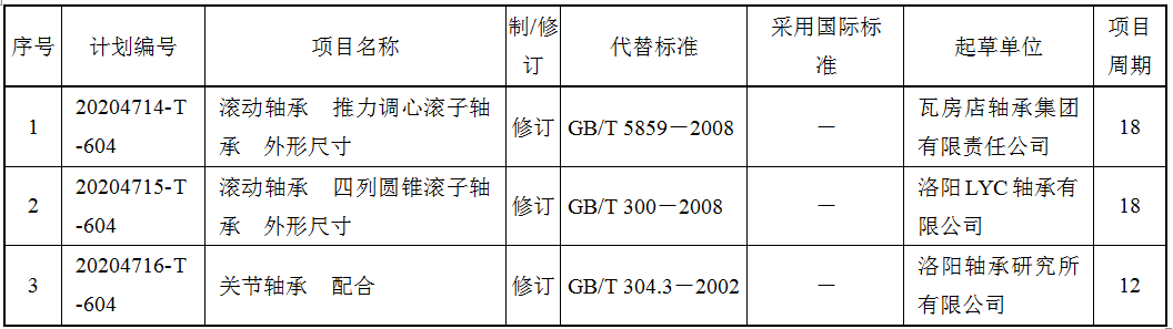 2020年12月24日,國家標準化管理委員會以國標委發(fā)[2020]53號文下達了2020年第四批國家標準制修訂計劃。本批共安排計劃524項,其中制定340項,修訂184項;推薦性標準517項,指導性技術(shù)文件7項。本次計劃中屬于滾動軸承領(lǐng)域的共3項,如下表所示: