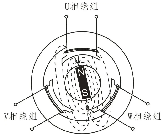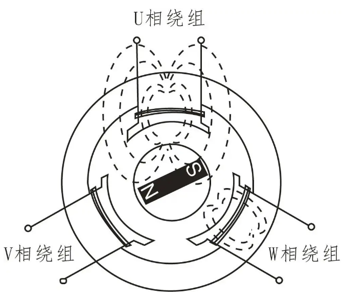 北汽 EV160 永磁同步電機具有電動機和發(fā)電機的雙重功能。電動機工作原理是電機控制器分別控制 U 相、V 相和 W 相繞組,或者相鄰繞組的通電、斷電,在相應(yīng)的繞組或相鄰的繞組中產(chǎn)生磁場,永磁轉(zhuǎn)子在磁場的作用下同步旋轉(zhuǎn),如圖4所示。車輛減速時,永磁同步電機起到發(fā)電機的作用。交流發(fā)電機的工作原理是車輛減速時,驅(qū)動輪通過傳動裝置反拖永磁同步電機轉(zhuǎn)子運轉(zhuǎn),旋轉(zhuǎn)的永久轉(zhuǎn)子磁場,分別切割 U、V、W 三相定子繞組,產(chǎn)生三相交流電,如圖5所示。