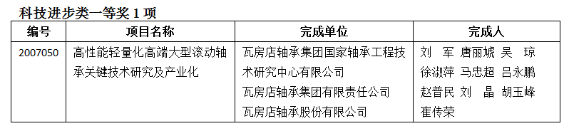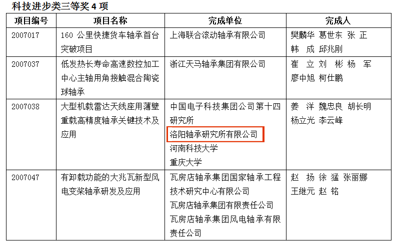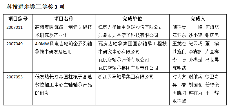 2020年11月18日,中國(guó)機(jī)械工業(yè)聯(lián)合會(huì)、中國(guó)機(jī)械工程學(xué)會(huì)聯(lián)合發(fā)文公布了2020年度中國(guó)機(jī)械工業(yè)科學(xué)技術(shù)評(píng)獎(jiǎng)結(jié)果。受表彰的2020年度中國(guó)機(jī)械工業(yè)科學(xué)技術(shù)獎(jiǎng)獎(jiǎng)勵(lì)項(xiàng)目共370項(xiàng),其中特等獎(jiǎng)9項(xiàng)、一等獎(jiǎng)38項(xiàng)、二等獎(jiǎng)133項(xiàng)、三等獎(jiǎng)190項(xiàng)。其中軸承行業(yè)獲得一等獎(jiǎng)1項(xiàng)、二等獎(jiǎng)3項(xiàng)、三等獎(jiǎng)5項(xiàng)。具體名單如下:
