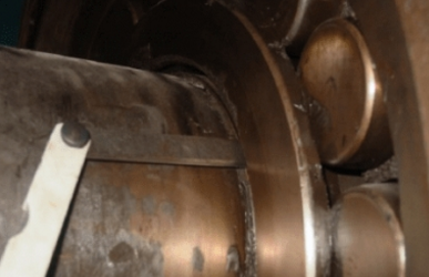 圖1、2表示減速機(jī)機(jī)殼軸承室與軸承外圈之間徑向間隙調(diào)整不當(dāng),造成的磨損。軸承與軸承室的配合。軸承外圈與軸承蓋之間為間隙配合,過(guò)緊會(huì)由于軸承轉(zhuǎn)動(dòng)時(shí)發(fā)生熱膨脹造成軸承徑向間隙過(guò)小,太松則使轉(zhuǎn)動(dòng)精度降低,轉(zhuǎn)動(dòng)易跳動(dòng)。故一般軸承外圈與軸承蓋之間有0.05-0. 10mm的徑向間隙,同時(shí)為保證轉(zhuǎn)軸受熱后的自由膨脹伸長(zhǎng),在軸承的推力與承力側(cè),軸承與軸承室端蓋之間應(yīng)留有足夠膨脹間隙。間隙與值與軸長(zhǎng)有關(guān)。