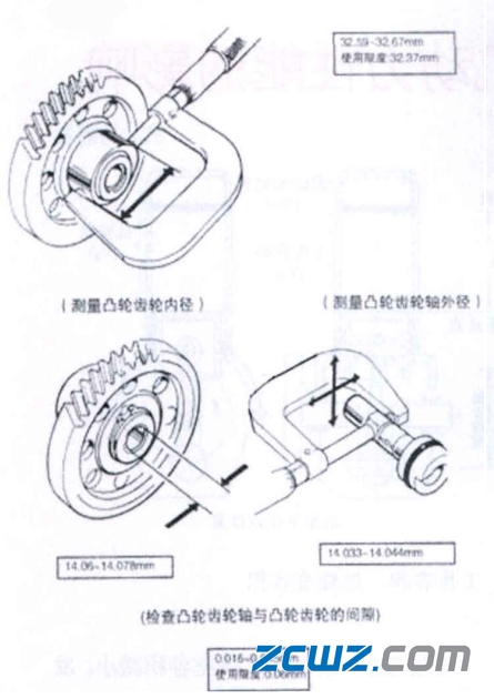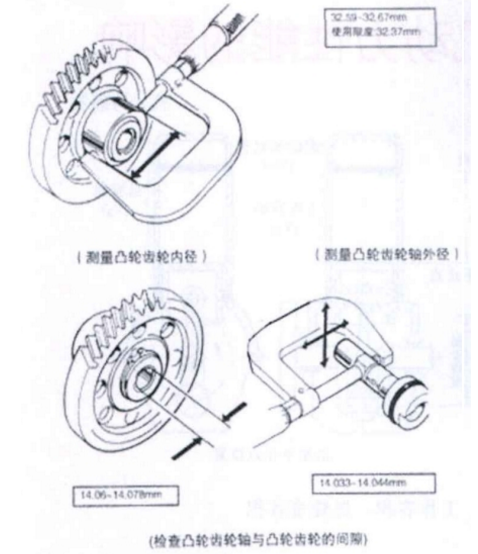 7、如是CG125款(挺桿機型),檢測凸輪升程高度和凸輪齒輪內(nèi)徑、凸輪齒輪軸外徑,對超過使用極限值的零件予以更換。