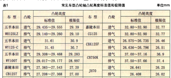 4、測定凸輪高度。如已超過使用極限值,則應(yīng)更換。常見車型凸輪高度標(biāo)準(zhǔn)值及使用極限值。同時,還需注意,如摩托車行駛路程個長,凸輪軸已經(jīng)磨損到極限值,說明個是凸輪軸的質(zhì)量有問題,就是該發(fā)動機通往凸輪軸油池的潤滑油道存在堵塞或部分堵塞,以及機油泵壓力下降等,應(yīng)仔細排查,直至恢復(fù)潤滑系統(tǒng)正常工作為止。否則,即使更換了新的凸輪軸,使用時間不長,還會發(fā)生異常磨損現(xiàn)象,望予以高度重視。