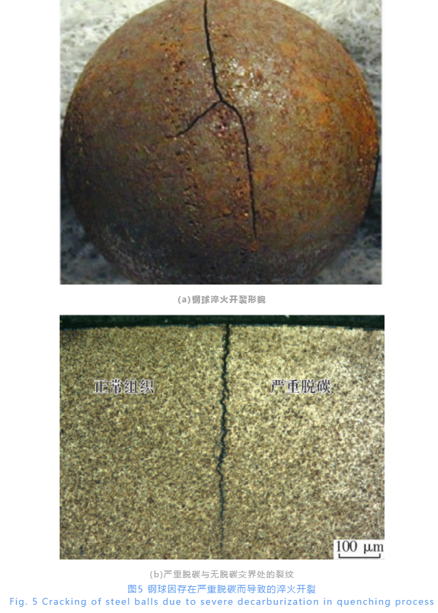 當(dāng)材料表層粗片狀珠光體較深時(shí)易殘留在零件表面。在后續(xù)淬火加熱過(guò)程中,由于片狀滲碳體易溶解,脫碳層中沒(méi)有或只有少量能阻礙奧氏體晶粒長(zhǎng)大的過(guò)剩碳化物,導(dǎo)致脫碳層的奧氏體晶粒長(zhǎng)得較大,當(dāng)冷卻條件較好能發(fā)生馬氏體轉(zhuǎn)變時(shí),馬氏體有機(jī)會(huì)長(zhǎng)得較粗大,也會(huì)出現(xiàn)粗大的低碳板條馬氏體,造成表層相對(duì)過(guò)熱的假像(圖4)。脫碳層硬度偏低,硬磨時(shí)精度較低,一旦遺留在產(chǎn)品表面則會(huì)降低其耐磨性,縮短接觸疲勞壽命。另外,嚴(yán)重的脫碳層還會(huì)造成產(chǎn)品淬火開(kāi)裂,形成廢品(圖5)。