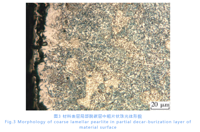 由于原材料表面脫碳層的含碳量較基體有所降低,在790℃左右加熱時(shí)已超過(guò)或接近圖2所示的SE相變線,脫碳層的奧氏體成分已完全均勻化或部分均勻化,此后冷卻就會(huì)得到全部或部分粗片狀珠光體組織(圖3)。這說(shuō)明熱軋(鍛)材表面的部分脫碳層會(huì)使球化退火相變溫度降低,若表層脫碳較嚴(yán)重,則球化退火后會(huì)轉(zhuǎn)變?yōu)榇制瑺钪楣怏w,這是最常見(jiàn)的一種脫碳層,在盤(pán)條上,一般僅存在于局部表面。粗片狀珠光體分布的最大深度即代表所檢試樣的脫碳層深度。