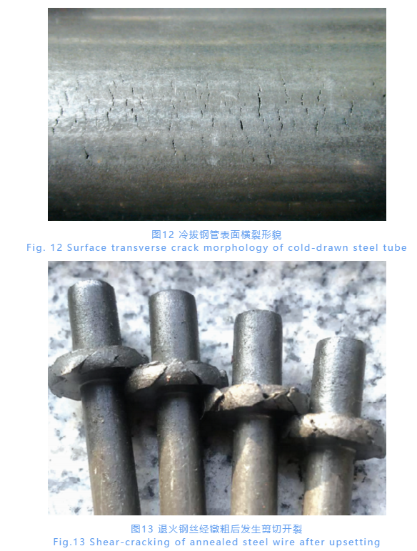 由于表面過(guò)熱層存在較深的粗片狀珠光體層,其塑性極差,在拉拔時(shí)表面易出現(xiàn)橫裂甚至斷裂;即使拉拔時(shí)不開(kāi)裂,也易導(dǎo)致后道冷鐓加工工序發(fā)生開(kāi)裂(圖12和圖13) ,危害極大。