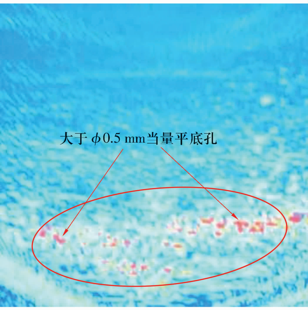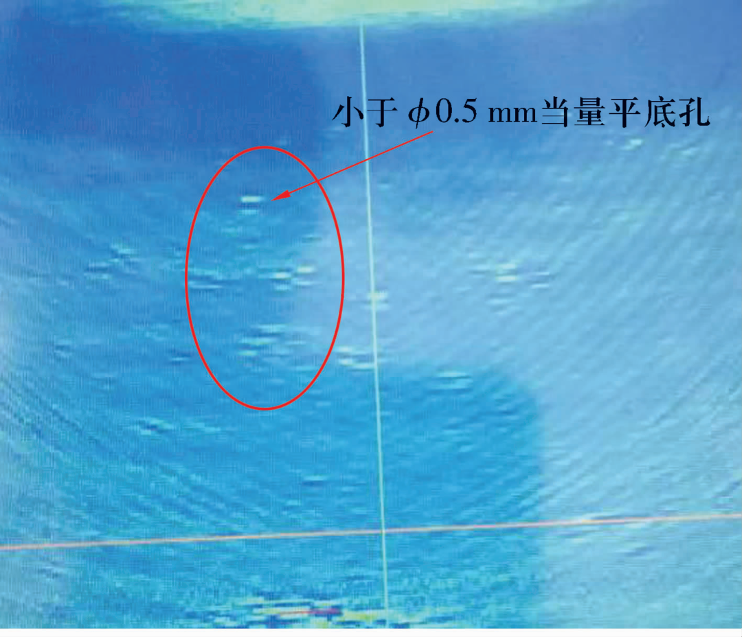 采用對比試塊法,考慮到內(nèi)部過燒缺陷常常體積較小,從單個缺陷定量和密集型缺陷定量兩方面考慮,綜合實踐經(jīng)驗,級別定為φ0.5 mm當量平底孔。