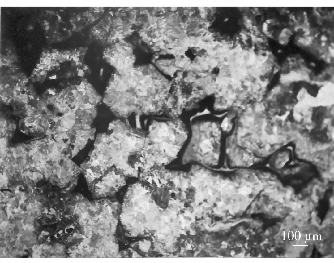 金相檢驗是控制軸承零件內(nèi)在質(zhì)量的重要手段,包括宏觀檢驗與微觀檢驗。某軸承滾子100倍過燒顯微金相圖像如圖2所示,過燒組織晶粒異常粗大,整個晶界層燒熔,在三角晶界處出現(xiàn)明顯的燒熔孔洞,呈黑色晶界網(wǎng)絡(luò)。