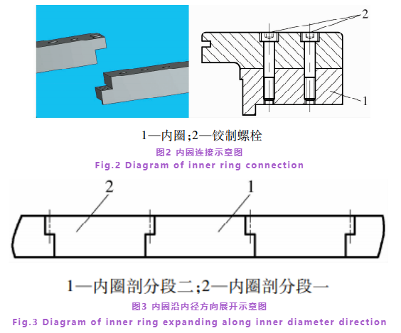 某剖分三排圓柱滾子轉(zhuǎn)盤軸承結構如圖1所示,采用階梯搭接,軸向用鉸制螺栓定位連接(圖2)的方式組合成整體內(nèi)、外圈,裝配后軸承內(nèi)圈沿內(nèi)徑方向展開如圖3所示。