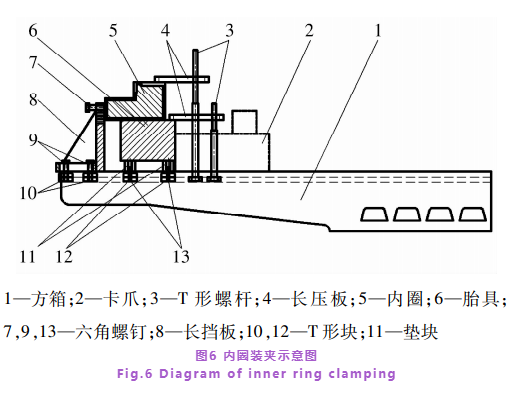 加工時要考慮胎具與剖分軸承的裝夾方式,以內(nèi)圈主推力滾道加工為例,內(nèi)圈裝夾如圖6所示。方箱底部設計2排連接孔,通過螺栓與機床工作臺連接??ㄗ⑻ゾ呖ňo并用壓板固定。內(nèi)圈放置在胎具上,長擋板頂緊外徑面,壓板壓緊內(nèi)圈端面。胎具和內(nèi)圈進行軸向和徑向定位,固定點數(shù)量是軸承分段數(shù)的3倍,防止零件加工中出現(xiàn)平移。