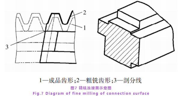 剖分面為臺階形狀,要求拼接軸向間隙不大于0.1 mm,徑向間隙不大于0.3 mm。拼接會影響軸承加工精度,因此要保證外齒圈剖分切口在齒槽底中心位置。工藝上選擇先劃出成品齒形及精銑連接面剖分線(圖7),其軸向和圓周貼合面均在數(shù)控龍門銑床上加工。通過程序設定、預先模擬調(diào)整每段弧長及2個結合面的角度和尺寸,多次研配結合面以確保連接精度,待連接整圓后依次配對編號。
