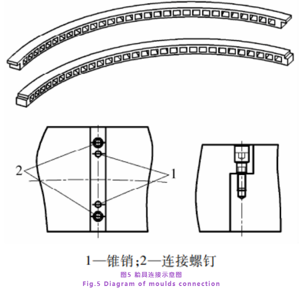 剖分軸承在胎具上加工,為便于吊裝,胎具也采用剖分結構。整個胎具分為4段,連接方式為上下搭接,軸向用錐銷定位,加雙排螺釘緊固(圖5)。