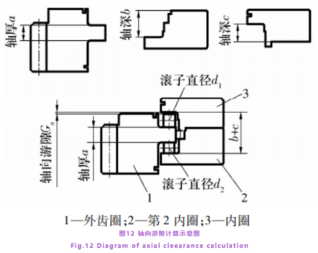 通過軸向游隙推算所需加工的內(nèi)、外圈軸向滾道尺寸,可減少滾道修磨次數(shù),從而減少吊裝、拼接次數(shù),提高加工效率。軸向游隙計算示意圖如圖12所示,軸向游隙Ga=b+c-a-d-d2。