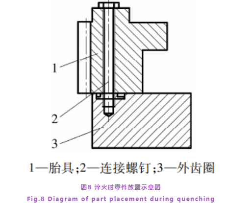 選取分段、分面淬火。為方便吊裝,淬火前加工吊裝孔。為減小淬火變形,在套圈上設置端面臺階,胎具設置凹槽(配合間隙1~2 mm)進行限位。另外,在胎具上加工與套圈吊裝孔位置一致的螺紋孔,用螺釘將套圈與胎具固定(圖8)。