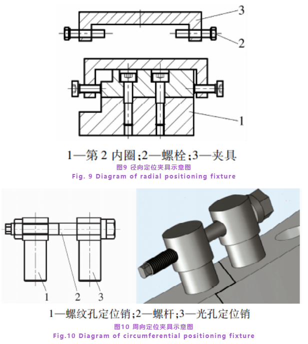 調(diào)整徑向間隙時,將夾具放置在套圈端面上,螺桿頂緊軸承內(nèi)、外徑面,通過螺桿調(diào)節(jié)。調(diào)整圓周方向間隙時,將螺紋孔定位銷與光孔定位銷分別放在連接縫處的2個安裝孔內(nèi),通過螺桿緊固調(diào)節(jié)。